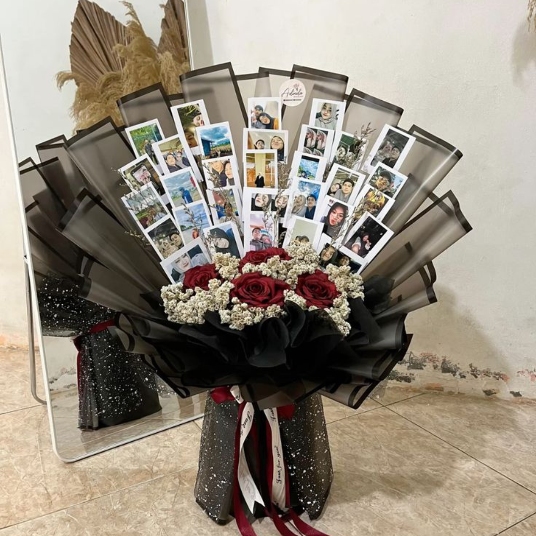 Make moments unforgettable with the Grand Photo Memory Rose Bouquet – a luxurious arrangement featuring deep red artificial roses, baby’s breath fillers, and 30+ personalized photo prints, all wrapped in shimmering black premium sheets.