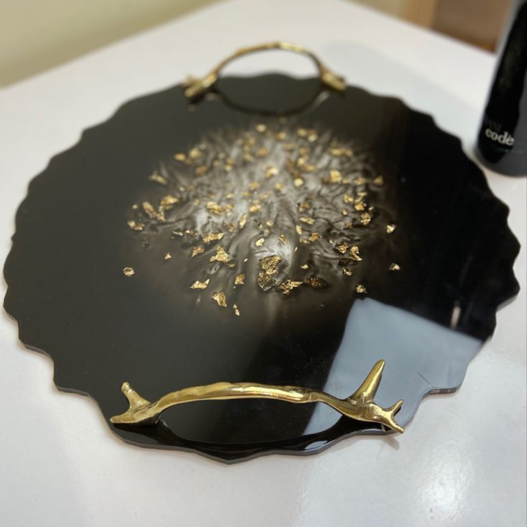 Add bold sophistication to your living space with HandKrafty’s Handmade Black Resin Tray, a perfect fusion of elegance and utility. Crafted with a glossy jet black resin base, this round tray is adorned with real gold foil flakes and finished with premium golden branch-style handles for a nature-inspired luxury look.