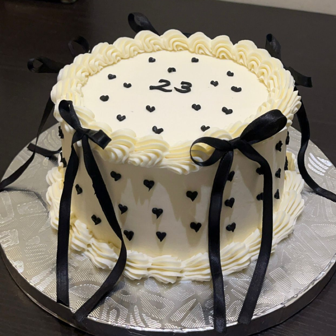 Celebrate a special age with timeless charm through our Monochrome Ribbon Heart Cake – Bold & Elegant Birthday Special. Featuring smooth white buttercream, tiny edible black hearts, piped swirls, and elegant black satin bows, this cake makes a bold yet romantic statement. The number “23” on top can be customized to match any age, making it ideal for birthdays, anniversaries, or classy celebrations.